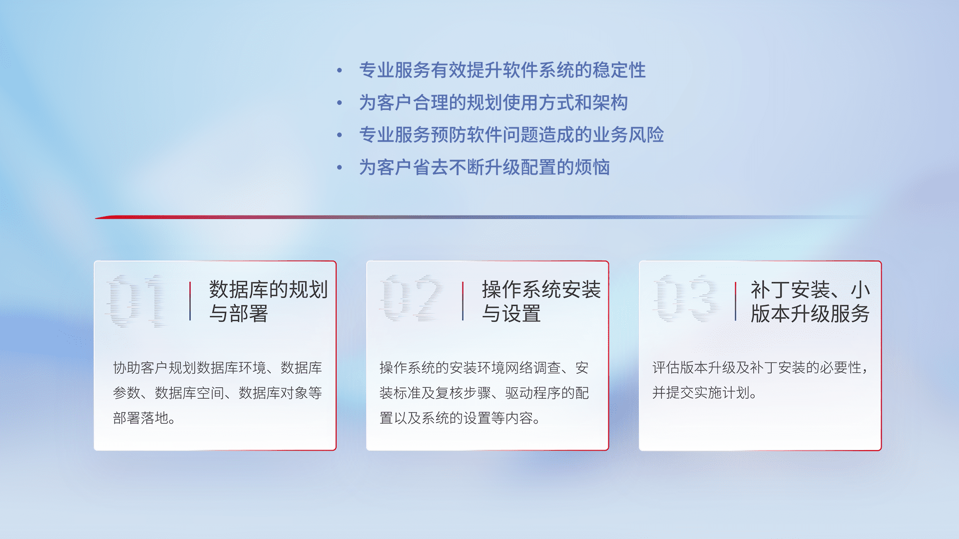 为客户提供软件规模升级、、、、快速部署、、、、按需配置的专业服务,,,,从数据库的规划与部署到操作系统的安装与设置,,,再到补丁安装和小版本升级提供支持。。。。