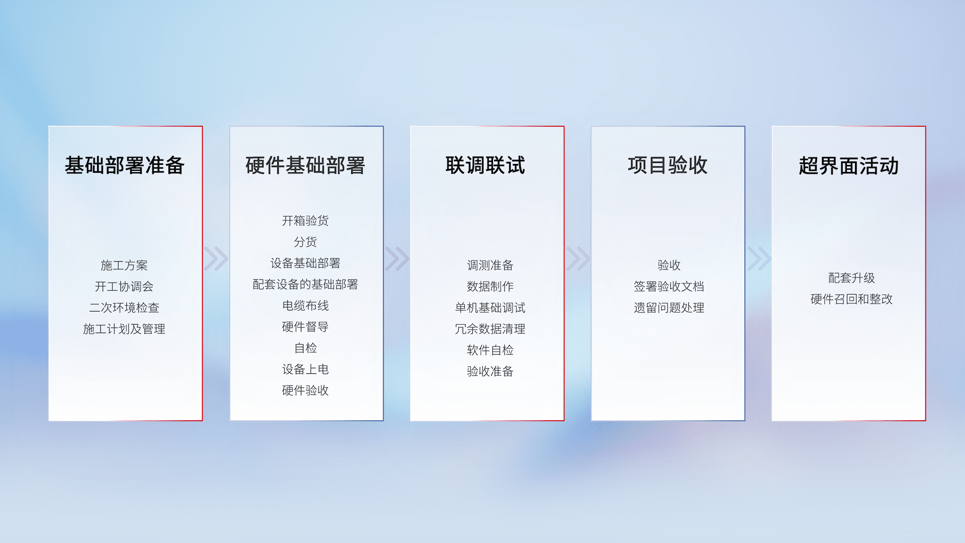 从基础部署准备、、硬件基础部署、、、联调联试、、项目验收、、、、越界面活动的全过程可追溯,,,,保证施工质量和进度。。